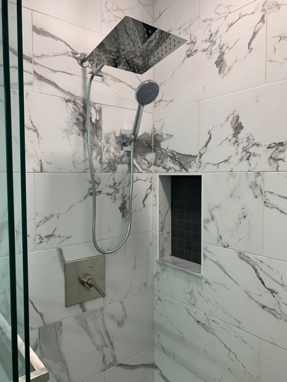 Primary bathroom remodel with new marble-look porcelain tile, including around the existing bathtub, new double vanity and countertop, walk-in shower with sliding glass doors, and new fixtures throughout.